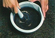 印度藍(固形)150gをすり鉢で砕き、水150ccを徐々に加えてなめらかになるまで練り上げ、